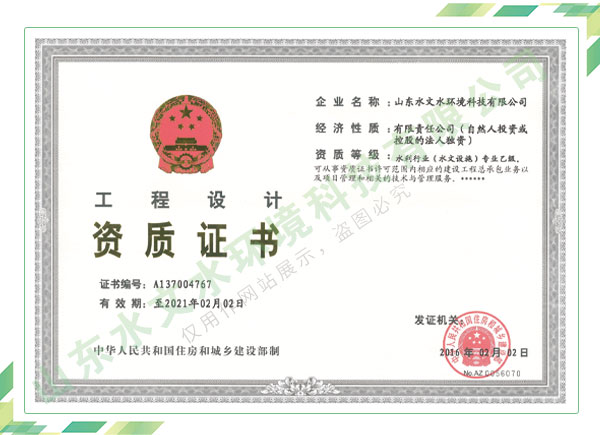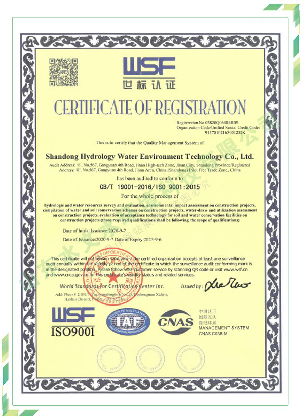 公司擁有水利工程設(shè)計(jì)、水土保持、水文水資源調(diào)查評(píng)價(jià)、水資源論證、建設(shè)項(xiàng)目環(huán)境影響評(píng)價(jià)、市政公用工程施工總承包、水利水電工程施工總承包、電子與智能化工程專業(yè)承包等資質(zhì),2017年通過質(zhì)量管理體系、環(huán)境管理體系、職業(yè)健康安全管理體系認(rèn)證;2020年被評(píng)為國(guó)家級(jí)高新技術(shù)企業(yè),同年被中國(guó)水利企業(yè)協(xié)會(huì)推薦為第一批“合同節(jié)水服務(wù)企業(yè)”;2021年被山東省、濟(jì)南市評(píng)為 “專精特新”中小企業(yè)。業(yè)務(wù)范圍涉及水利工程設(shè)計(jì);節(jié)水設(shè)計(jì)、改造、水平衡測(cè)試;山洪災(zāi)害調(diào)查;城市水資源調(diào)查評(píng)價(jià);建設(shè)項(xiàng)目水土保持方案編制、監(jiān)測(cè)、驗(yàn)收、水土保持規(guī)劃;水安全保障規(guī)劃、建設(shè)項(xiàng)目水資源論證、規(guī)劃水資源論證;建設(shè)項(xiàng)目環(huán)境影響評(píng)價(jià);入河排污口論證;防洪影響評(píng)價(jià);市政公用工程施工、水利水電工程施工、電子與智能化工程施工等。